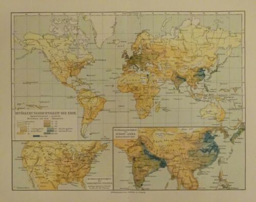 1898 - Bevölkerungsdichtigkeit der Erde, Landkarte, alter Druck