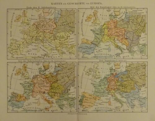 1898 - Karten zur Geschichte von Europa - Ende des II. Jahrhunderts, Zeit der Karolinger, Zeit der Hohenstaufen, Zeit Napelons I. , alter Druck