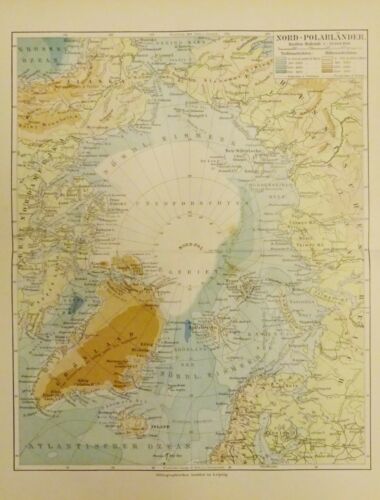 1899 - alter Druck - Landkarte Nord-Polarländer, Karte der Südpolarforschungen (Maßstab: 1: 25 000 000)