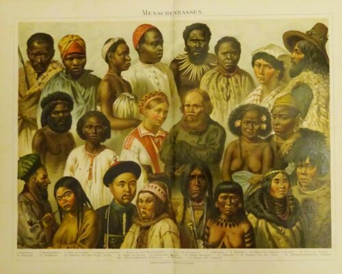 1899 - alter Druck - Menschenrassen (Buschmann, Namaquafrau, Frau von Loango,...