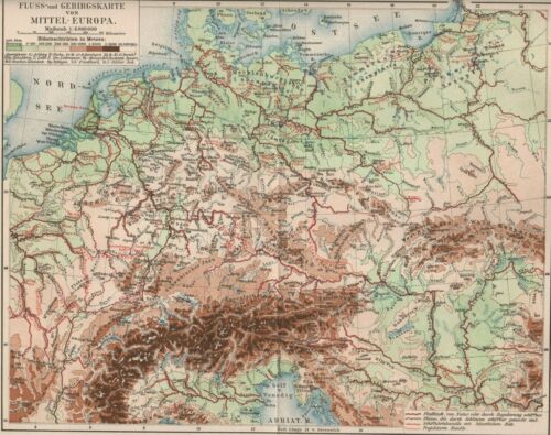 1908 - alter Druck - Fluss- und Gebirgskarte von Mittel-Europa