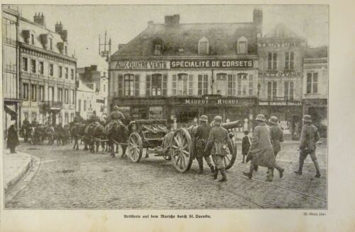 1917 - alter Druck - Artillerie auf dem Marsche durch St. Quentin
