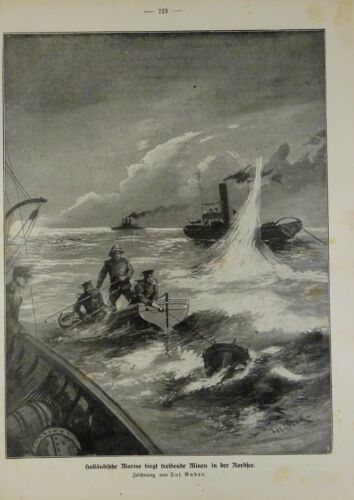1917 - alter Druck - Holländische Marine birgt treibende Minen in der Nordsee (Zeichnung von Jos. Gaber)
