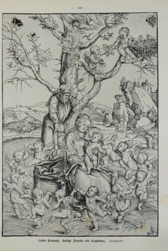 1917 - alter Druck - Lukas Cranach: Heilige Familie mit Engeltanz (Holzschnitt)