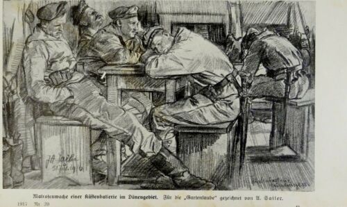 1917 - alter Druck - Matrosenwache einer Küstenbatterie im Dünengebiet (Für die "Gartenlaube" gezeichnet von U. Sailer)