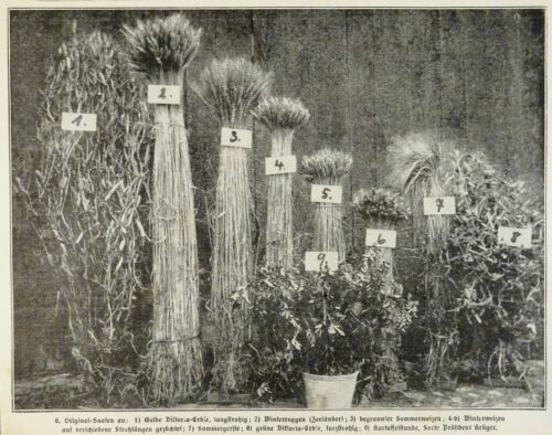 1) Gelbe Viktoria-Erbse, langstrohig; 2) Winterrogen (Zeeländer); 3) begrannter Sommerweizen; 4-5) Winterweizen auf verschiedene Strohlängen gezüchtet; 7) Sommergerste; 8) grüne Viktoria-Erbse, kurzstrohig; 9) Kartoffelstaude, Sorte Präsident Krüger