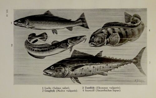 1926 - Fische - Lachs, Tunfisch, Lengfisch, Seewolf, ... - alter Druck