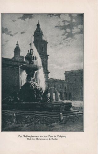 1927 - Der Residenzbrunnen vor dem Dom in Salzburg - Nach einer Radierung von E. Sander , alter Druck
