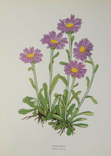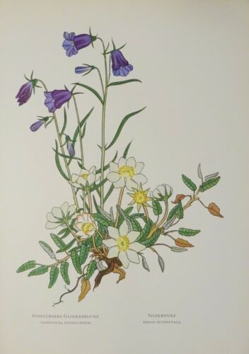 Alpen-Aster, Scheuchzers Glockenblume,... kolorierter Holzschnitt, alter Druck aus dem Jahr 1954