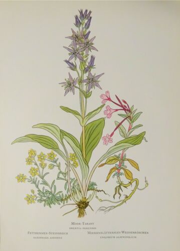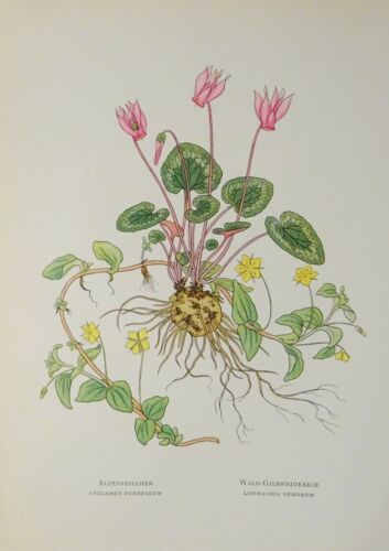 Alpenveilchen, Wald-Gilbweiderich, ... kolorierter Holzschnitt, alter Druck aus dem Jahr 1954