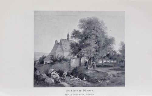 Alter Druck von 1917 - Kirchlein in Böhmen / Sonnenuntergang
