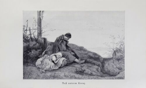 Alter Druck von 1917 - Rast unterm Kreuz / Ritt durch den Wald