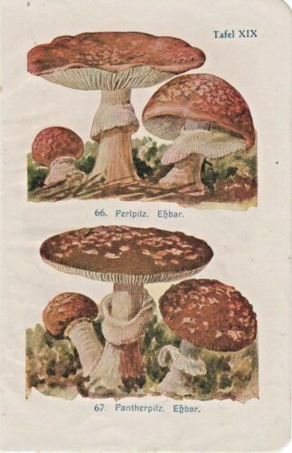 Alter Farbendruck von 1918 - Perlpilz, Pantherpilz