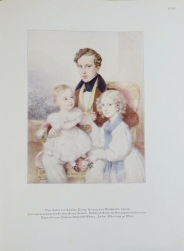 1941 - Drei Enkel des Kaisers Franz: Herzog von Reichstadt, sitzend, hält auf dem Knie den kleinen Franz Joseph. Rechts stehend, die Herzogin von Salerno. Aquarell von Nepomuk Ender - alter Druck