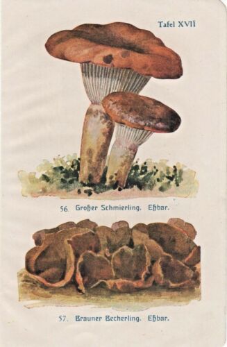 Alter Farbendruck von 1918 - Großer Schmierling, Brauner Becherling