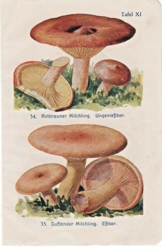 Alter Farbendruck von 1918 - Rotbrauner Milchling, Duftender Milchling