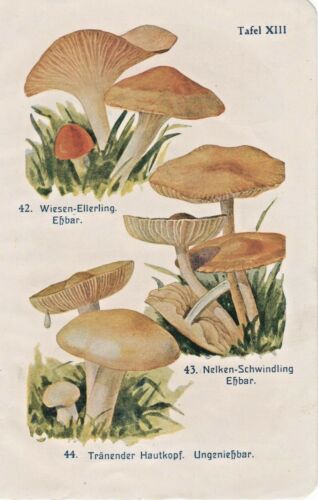 Alter Farbendruck von 1918 - Wiesen-Ellerling, Nelken-Schwindling, Tränender Hautkopf