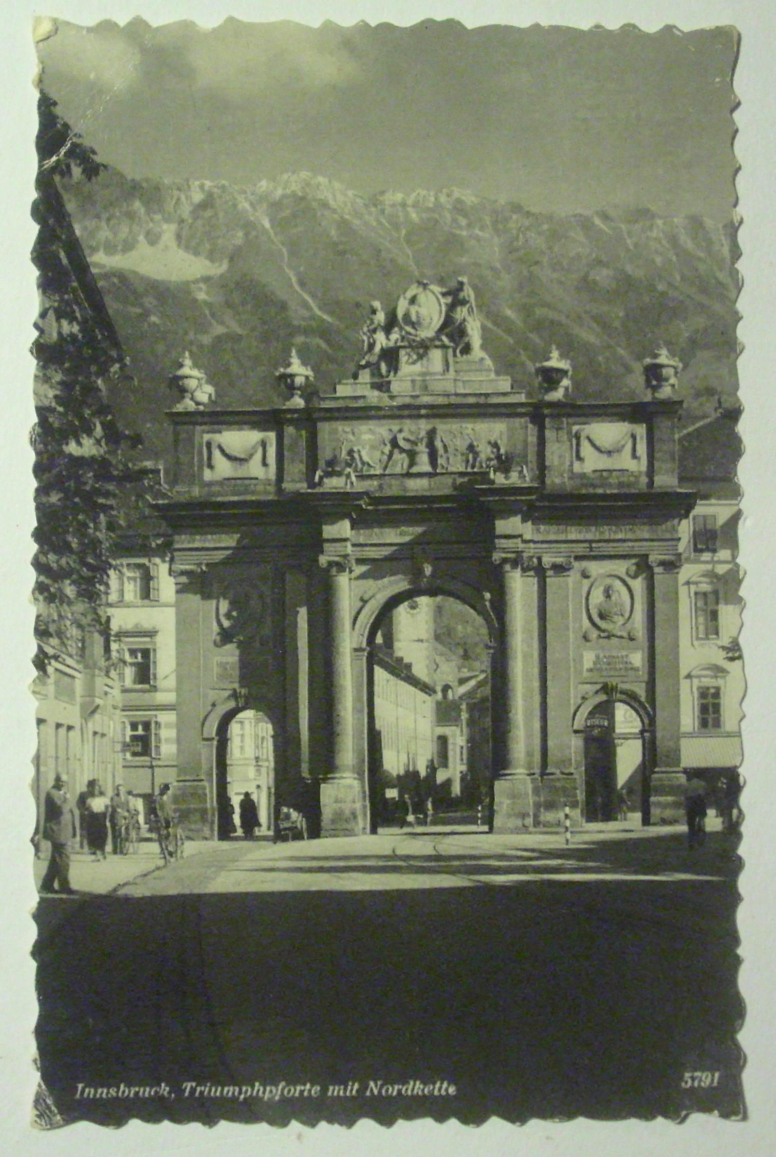 Ansichtskarte Innsbruck, Trimphpforte mit Nordkette (1955)