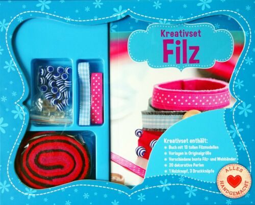 Dieses Set enthält ein farbig bebildertes Anleitungsbuch mit Grundlagenteil und 13 verschiedenen Filzmodellen für Erwachsene und Kinder, einen Vorlagenbogen mit Vorlagen in Originalgröße sowie alle Materialien, die Sie benötigen, um drei schicke Armbänder aus Filz zu gestalten: bunte Filz- und Webbänder, einen rustikalen Holzknopf, dekorative blau-weiß gestreifte Perlen sowie Druckknöpfe, um die Armbänder zu verschließen. So können Sie sofort loslegen!