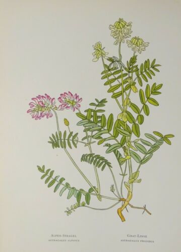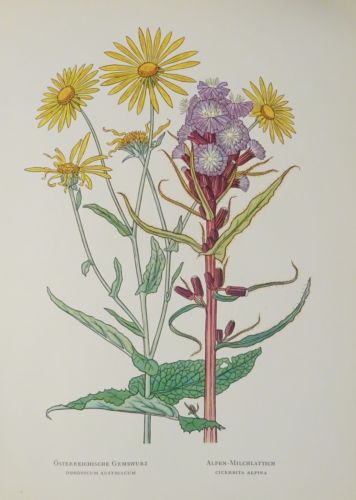 Österreichische Gemswurz, ... kolorierter Holzschnitt, alter Druck aus dem Jahr 1954